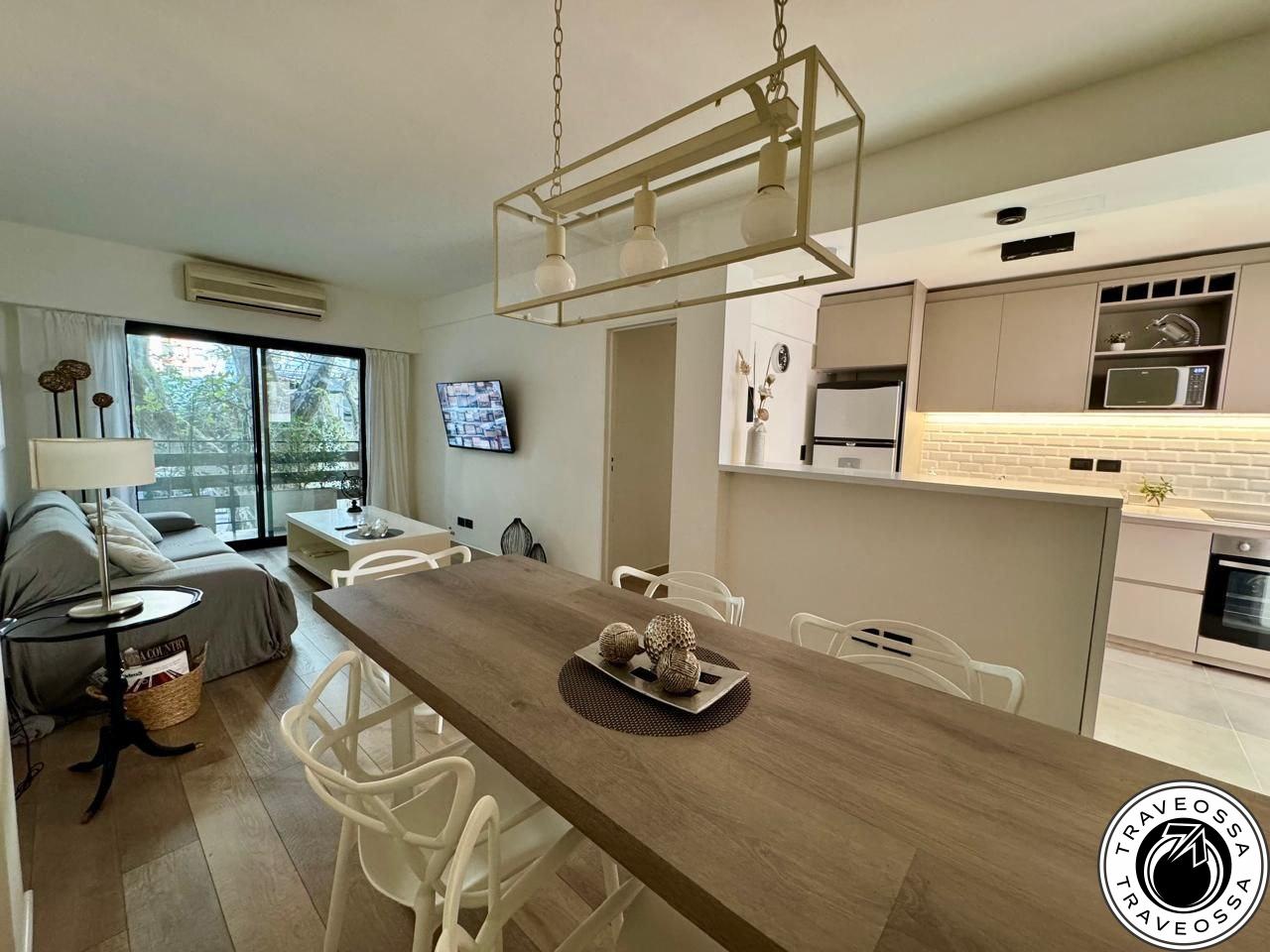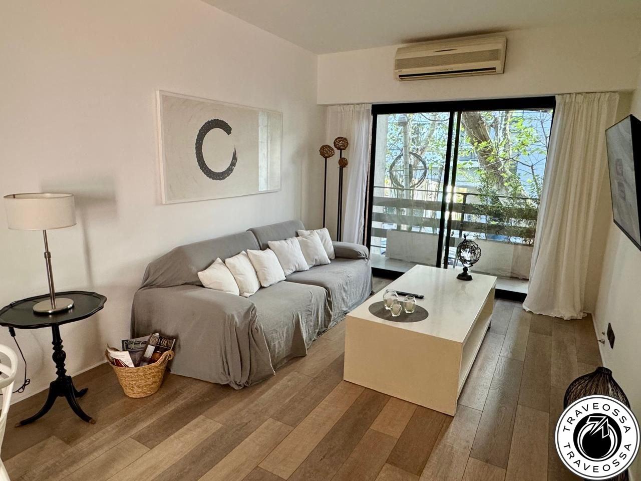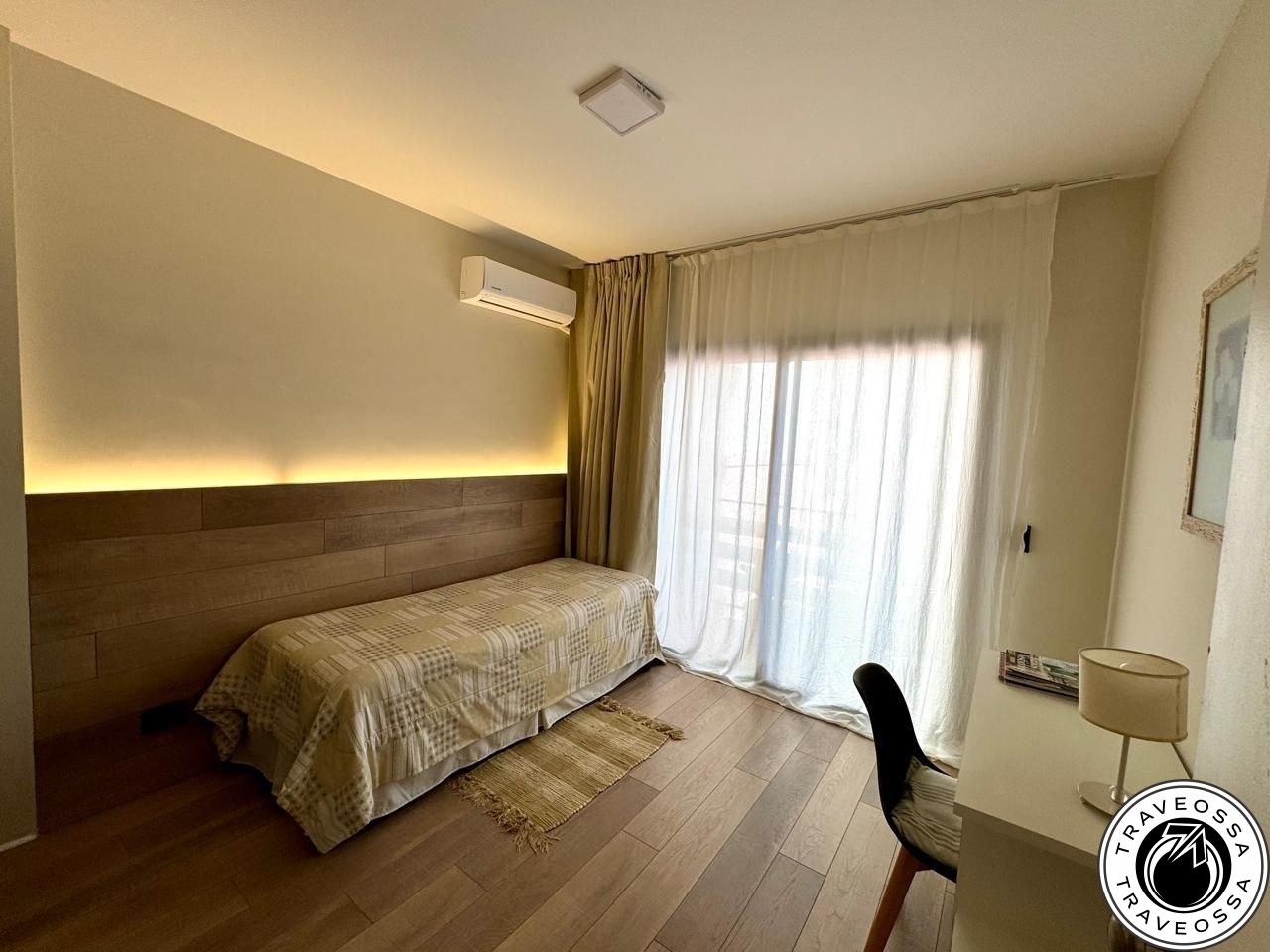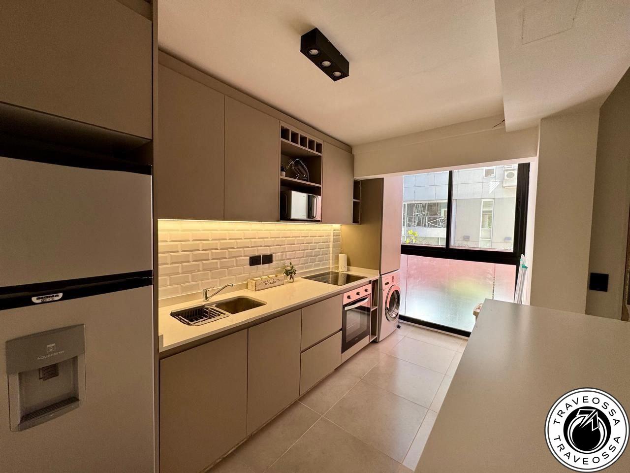 Depósito de un mes; comisión 20 % - Acerca de: 3 ambientes; living con sofá, Smart-TV y comedor; cocina equipada con barra y lavarropas; dormitorio principal con cama doble y placard; segundo dormitorio con cama single, placard y espacio de trabajo; baño con ducha; AA frío/calor