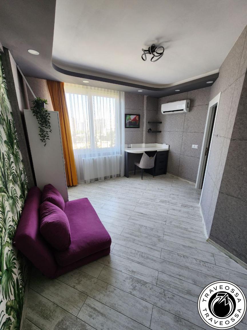 This spacious 2-bedroom + living-room apartment on the 8th floor is free from April 26 to May 7, 2025. Fully equipped for up to 7 guests with kitchenware, refrigerator, gas boiler, 3 air-conditioners, 2 TVs, Wi-Fi, bathroom, and excellent sound insulation. Just 200 m from the beach, with shops and a bus stop nearby.