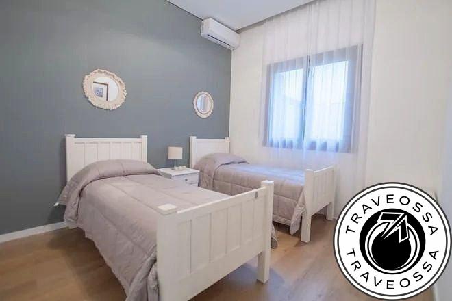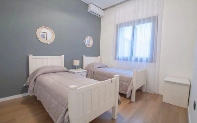 - About: Bright living room with sofa, table, Smart TV and dining area; balcony; kitchen with bar counter, dishwasher and utility room with washer; Bedroom 1: double bed, wardrobe, Smart TV; Bedroom 2: two single beds, wardrobe; Bedroom 3: single bed, chest of drawers; two bathrooms with bath and shower; guest WC; A/C in every room; underfloor heating.