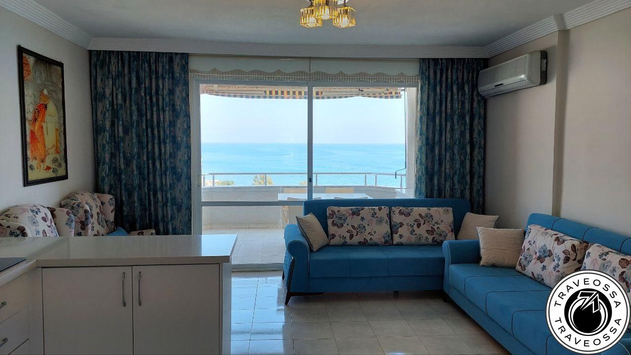 Enjoy breathtaking sea views from both the living room and bedroom in this exclusive 1+1 apartment. Located in a top-tier beachfront complex with a private beach, park, multiple pools, and on-site shops. Available May through September.